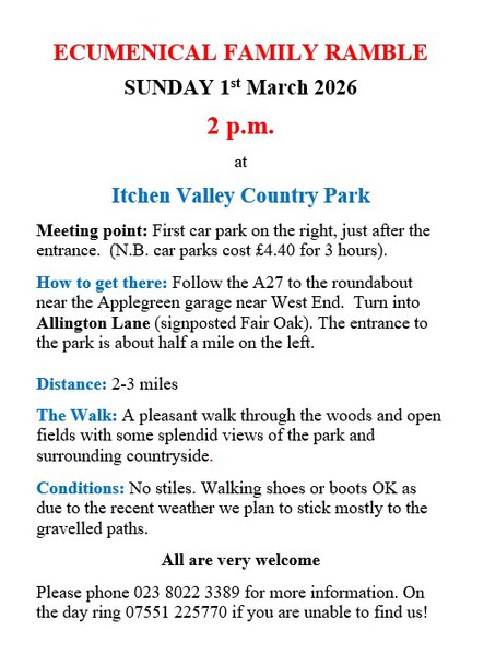 | Sunday 1st March @ 2pm | Ecumenical Family Ramble | No need to book, just turn up at Itchen Valley. |